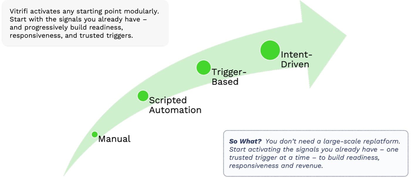 The diagram below shows the progression from manual processes to intent-driven orchestration – demonstrating how readiness signals can be activated reliably without a full transformation.
